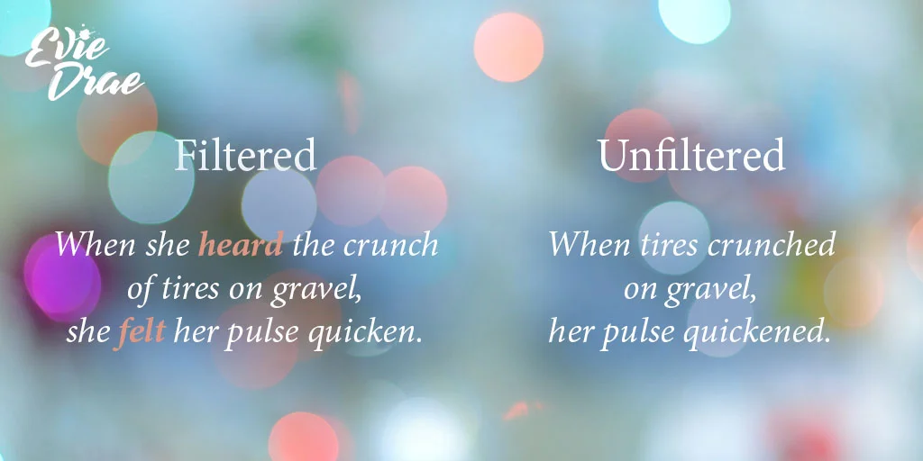 These are words that unnecessarily filter something through your character’s POV rather than allowing the reader to experience it for themselves. These little guys are tricky, because as with every rule, there are exceptions here. Sometimes the only way to express something is through a filter word. But I would recommend you take a step back and make sure it’s necessary before you leave it there.